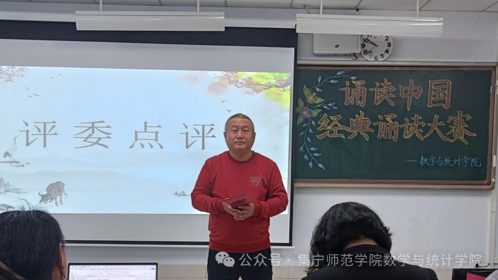 为贯彻落实党的二十届三中全会精神,加强服务教育强国、文化强国建设,加大国家通用语言文字推广力度,传承发展中华优秀语言文化,发扬中华经典诵读文化,数学与统计学院于9月29日在逸夫楼2Y301举办以“诵读中国”为主题的经典诵读大赛。出席本次比赛的有办公室主任任立华、团学办主任高霞、辅导员刘紫玉。