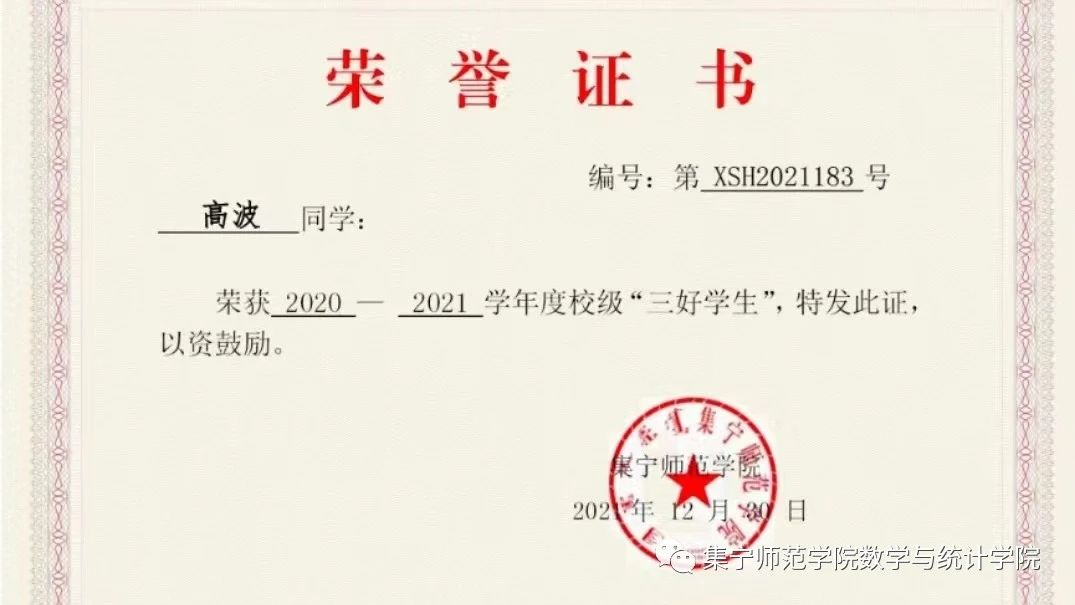 良好的班风、学风是取得优异成绩的前提,同学们的共同努力是取得优异成绩的保证。班级内各个班委分工明确,责任到人,班级日常管理稳定有序。同学们经常在一起探讨学习上的问题,互帮互助,共同进步。在院领导组织的班级上课情况抽检中,该团支部上课纪律良好且未出现缺课的情况。2020年获得数学与统计学院“团结奋进班集体”。该团支部同学的荣誉也是数不胜数,如:2020“开拓杯”校园文学综合实践获奖同学共计27人,获内蒙古自治区2020“开拓杯”英语作文大赛奖共计27人,获内蒙古自治区2021“开拓杯”英语作文大赛奖共计36人。