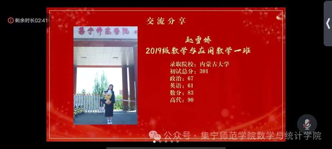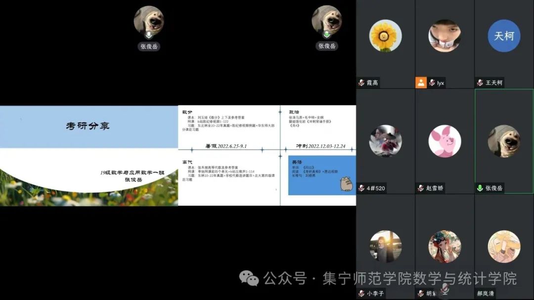 “长关漫道书为马,铁戟金戈笔作枪。”考研,就像是一场漫长而又充实的马拉松。它既是知识的积累,也是意志的考验。为了帮助准备考研的学生能更好地了解考试的形式和难度,从而做好充分的心理准备。数学与统计学院团总支开展“我为同学办实事”主题团日活动,邀请考研上岸同学,张俊岳、赵雪娇为在校学弟学妹们分享考研经验。