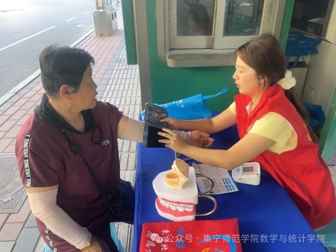 2023级数学与应用数学二班张婉皎满怀热忱地为当地老年人提供志愿服务。她一边细心地为老人们测量血压,一边耐心叮嘱注意事项,还贴心送上实用的牙齿护理工具,用温暖举动传递真切关怀,让实践充满浓浓暖意。