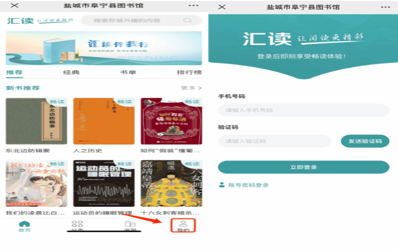 3.首次访问汇读平台的读者,点击页面右下角【我的】-输入手机号+验证码注册个人账号。