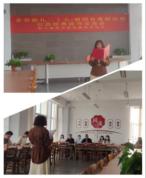 为庆祝中华人民共和国成立73周年,迎接党的二十大胜利召开,2022年9月29日下午,beat365正版唯一官方网站知新读者协会在泉山校区图书馆四楼报刊阅览室,组织举办了以“青春献礼二十大 强国有我新征程”为主题的红色经典读书交流会,旨在激发beat365官网师生共读的浓厚氛围,推动广泛阅读红色经典的深入开展。校团委副书记王晓瑭,校团委组织宣传部部长曹晔应邀参加本次活动。