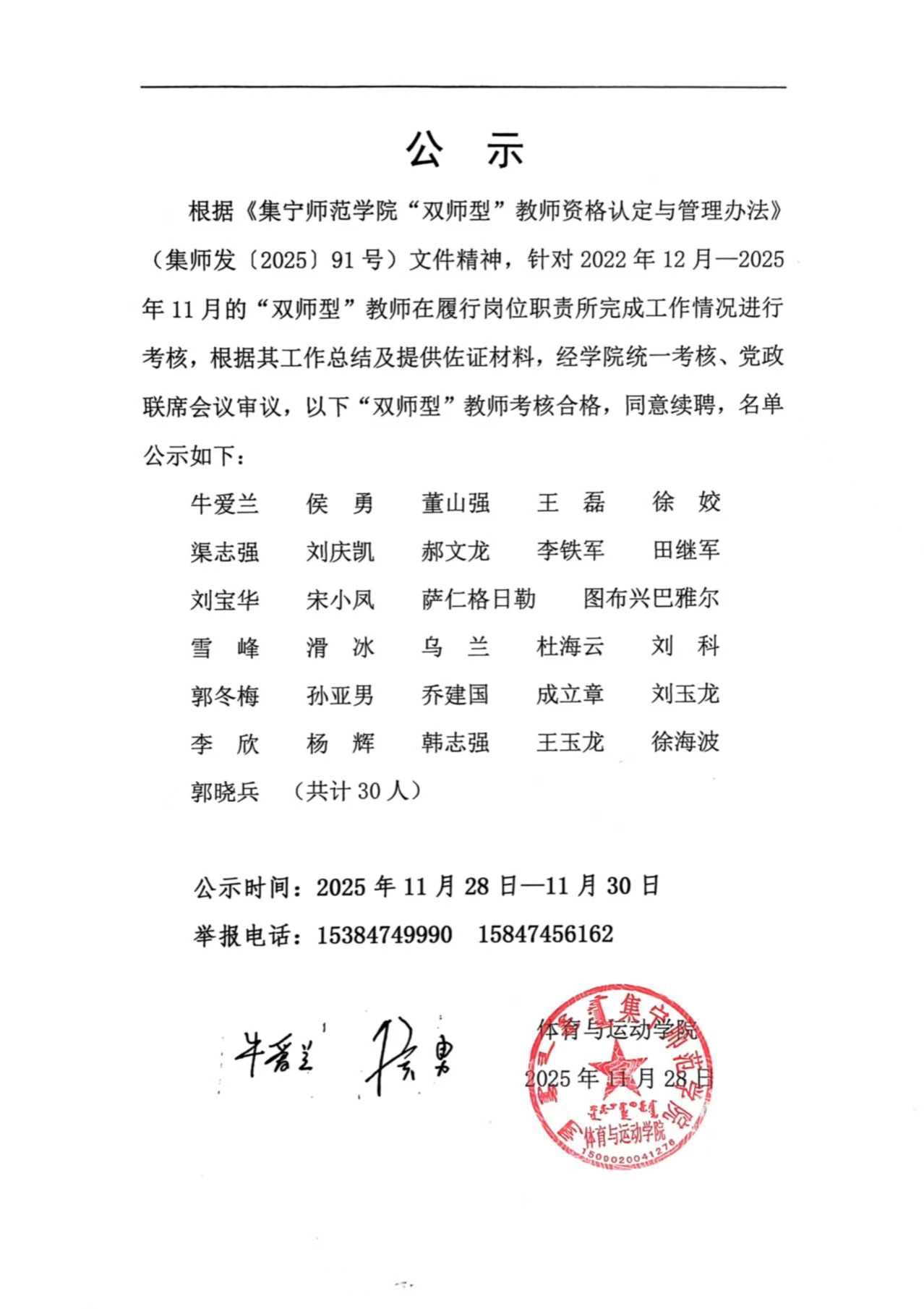 体育与运动学院“双师型”教师聘期考核结果 公示