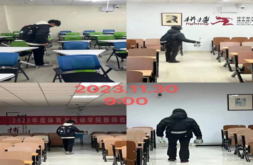 近期beat365官网学生感染流感人数较多,为有效预防流感在beat365官网的传播,切实保障师生的身体健康,体育与运动学院领导班子决定对逸夫楼教学区域、办公区域以及宿舍进行全面消杀工作。