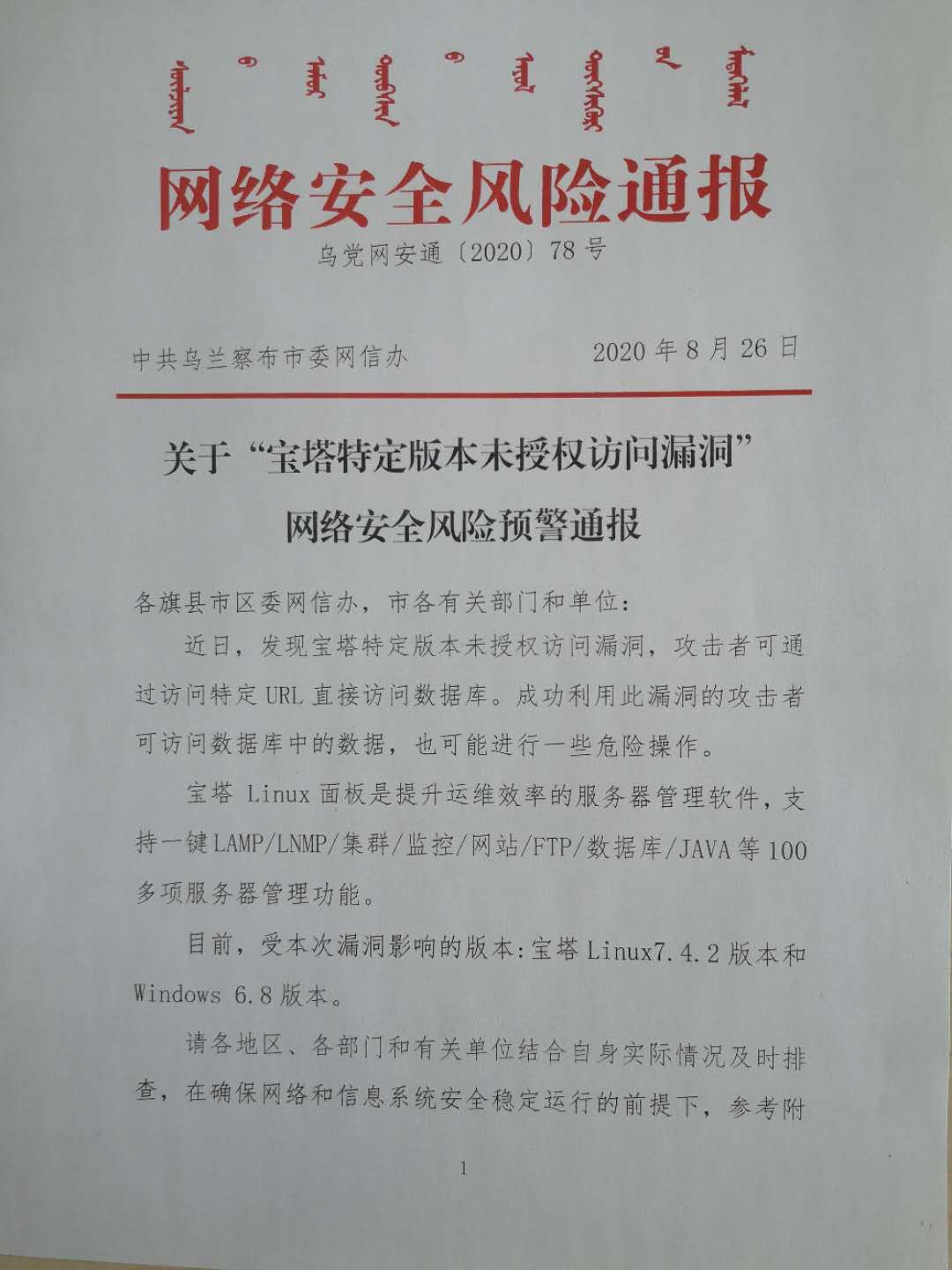 关于“宝塔特定版本未授权访问漏洞”网络安全风险预警通报