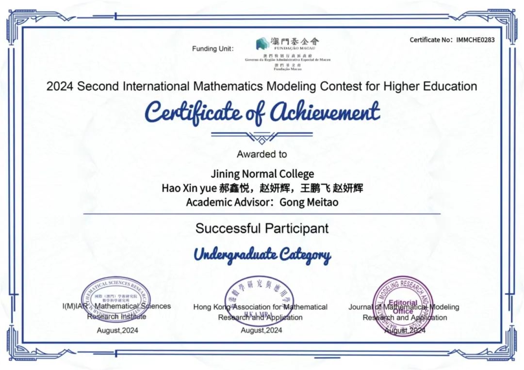 为了在学术的浩瀚星空中绽放光芒,为了追寻心中的梦想与激情,物理与电子信息工程学院的学子们不断探索前行。我院共有五支队伍报名参加2024年国际高校数学建模竞赛,此项竞赛是国际(澳门)学术研究院数学科研研究所、数学建模研究与应用期刊社联合香港数学研究与应用学会主办,为列入澳门特别行政区政府澳门基金会(行政长官直属)立项资助名单的国际学科竞赛,旨在培养学生数学应用、创新意识与团队协作的能力。此项竞赛于2024年7月26日20时开始,持续四天于2024年7月30日20时结束。我院15名学生在这场激烈的角逐中全力以赴,最终脱颖而出,成绩斐然!