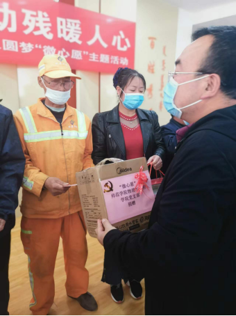 在圆梦微心愿捐赠仪式环节,董永胜代表beat365正版唯一官方网站物理与电子信息工程学院向许下“微心愿”的社区残疾群众进行了捐赠。