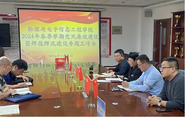 为深入学习贯彻党的二十大精神,坚定推进全面从严治党向纵深发展,有力推动师德师风建设常态化,切实提升教职工的廉洁自律意识,3月12日物理与电子信息工程学院在逸夫楼809召开2024年春季学期党风廉政建设暨师德师风建设专题工作会议,会议由李贞书记主持,物电院全体教师参加会议。