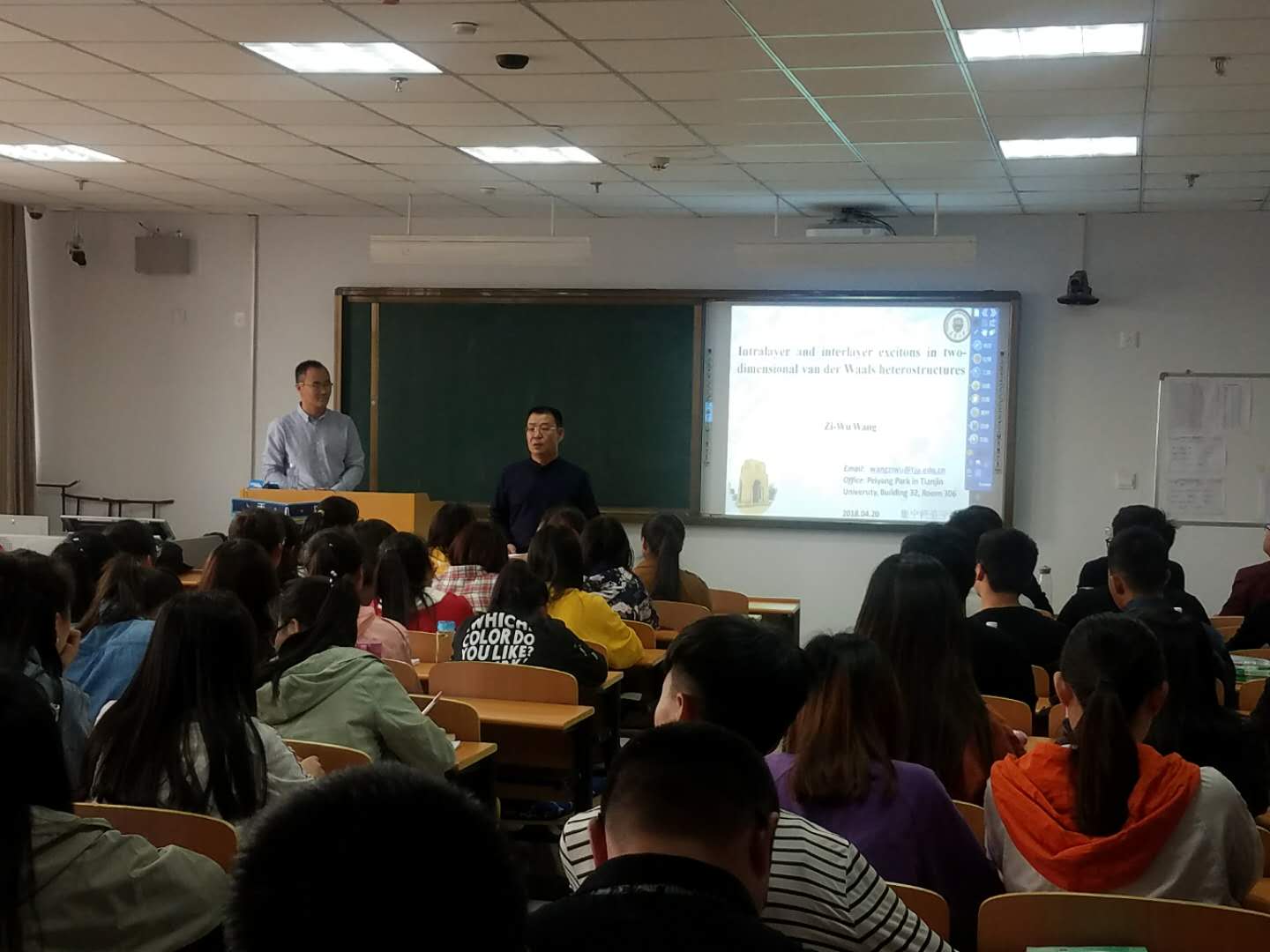 4月20日,物理学院、科研设备处邀请王子武博士作学术报告,报告题目为“二维范德瓦尔斯异质结中的层内和层间激子态”。 物理学院院长胡文弢主持报告会,物理学院、化学学院部分师生在逸夫楼403听取了报告。