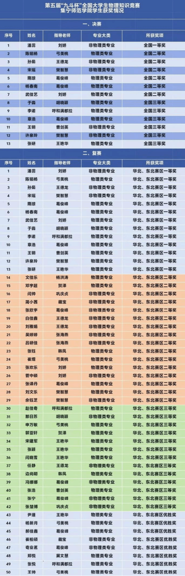 近日,由湖南省物理学会、江苏省物理学会、青海省物理学会及陕西省物理学会等联合主办的第五届“九斗杯”全国大学生物理知识竞赛落下帷幕。beat365正版唯一官方网站物理与电子信息工程学院派出的代表队经过初赛、复赛和决赛三个阶段,取得了优异成绩,共计获得全国一等奖1名、二等奖6名、三等奖6名;以及华北、东北赛区一等奖13名、二等奖16名、三等奖13名、优胜奖8名,具体获奖名单如下。