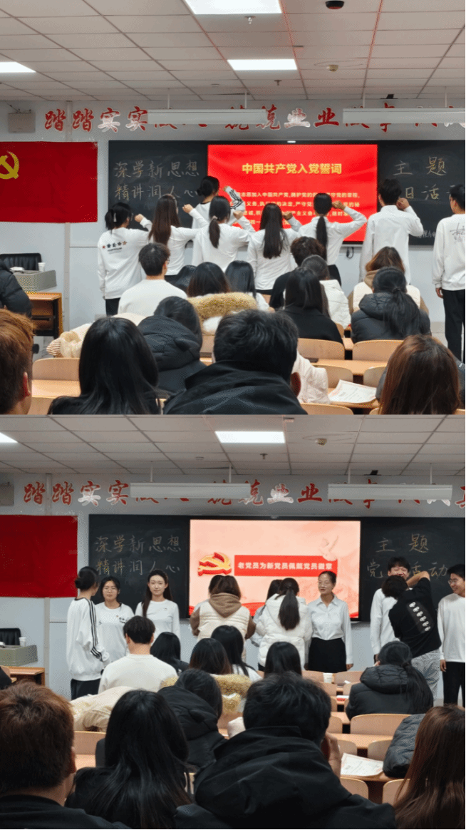 首先老党员为新党员佩戴党员徽章,一枚枚鲜红的党员徽章,是身份的象征,更是责任的赋予。随后,由学生党员郝鑫悦同志领誓,带领郝聪慧等七名同志进行了入党宣誓。