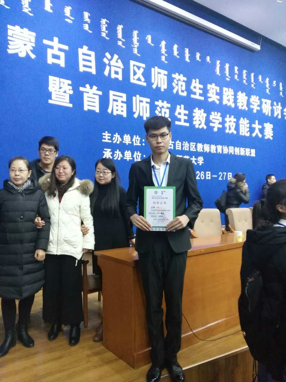为深化大学生实践教学改革,加强各高校教师教育经验交流。内蒙古自治区教师教育协同创新联盟于2016年11月27日在内蒙古师范大学举办了内蒙古自治区师范生实践教学研讨会暨首届师范生教学技能大赛。由我系教师郭晓霞、马振寰带领2014级物理学班王刚、王海玲两位同学赴呼和浩特市参加了本次比赛。