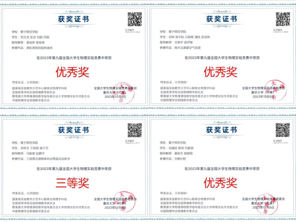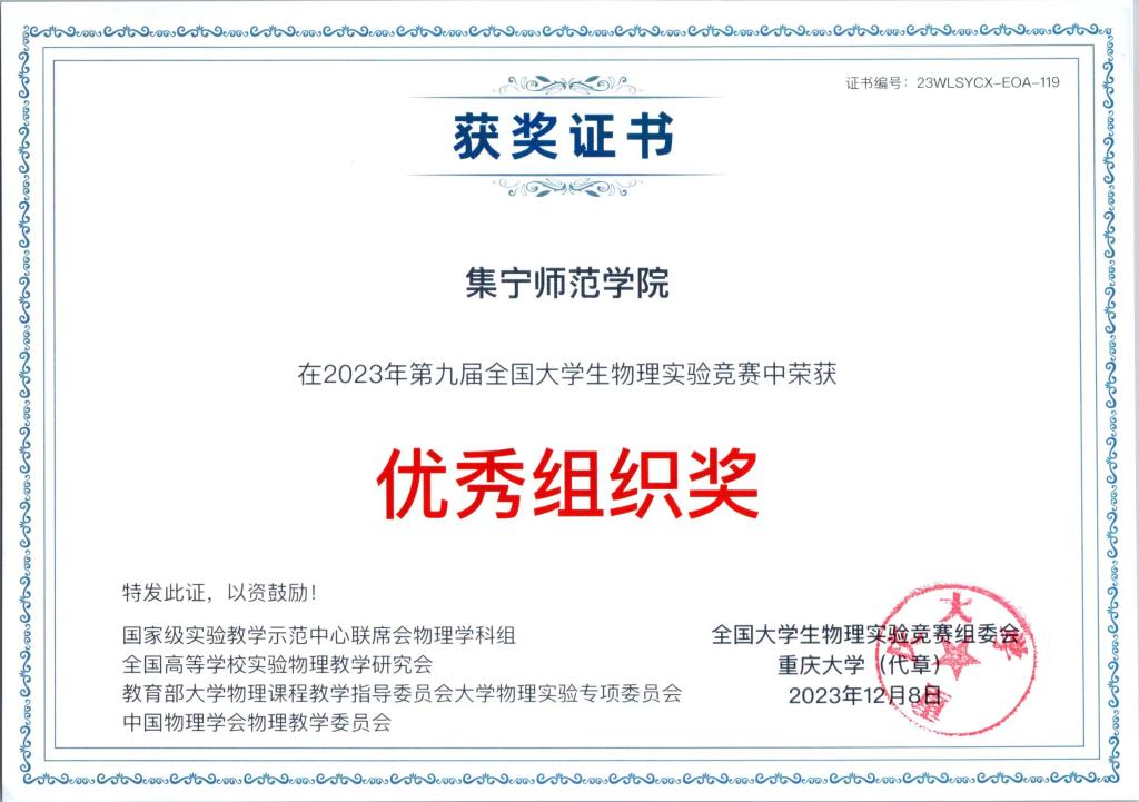近日,第九届全国大学生物理实验竞赛结果公布,我院学生获得三等奖1项、优秀奖3项,beat365官网获得优秀组织奖。