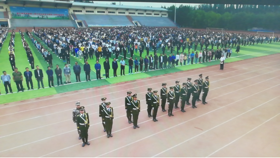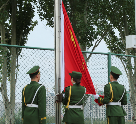国旗护卫队口号嘹亮,迈着整齐铿锵的步伐走向国旗台。伴着雄壮的《义勇军进行曲》,五星红旗在师生们庄严的注目礼中冉冉升起,迎风飘扬。