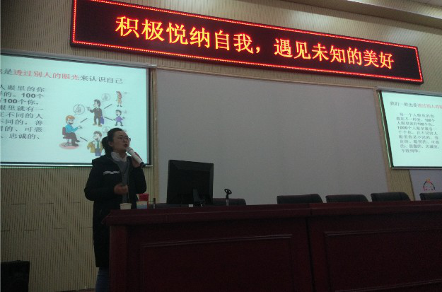 吕峰以 “积极悦纳自我,遇见未知的美好”为题作了专题讲座。通过理论讲解、案例分析、技能传授等方式,引导学生认识自我,悦纳自我,从而达到身心平衡,更好的投入到学习与生活中去。吕峰以深入浅出的讲解、丰富有趣的心灵故事、新奇经典的心理实验以及贴近现实的案例,吸引了同学们的兴趣,促进了良好的互动。