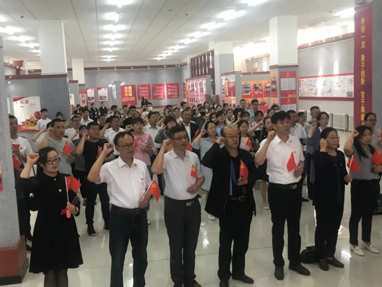 全体师生党员在鲜艳的党旗下高唱国歌,重温入党誓词,满怀激情的唱起《没有共产党就没有新中国》。