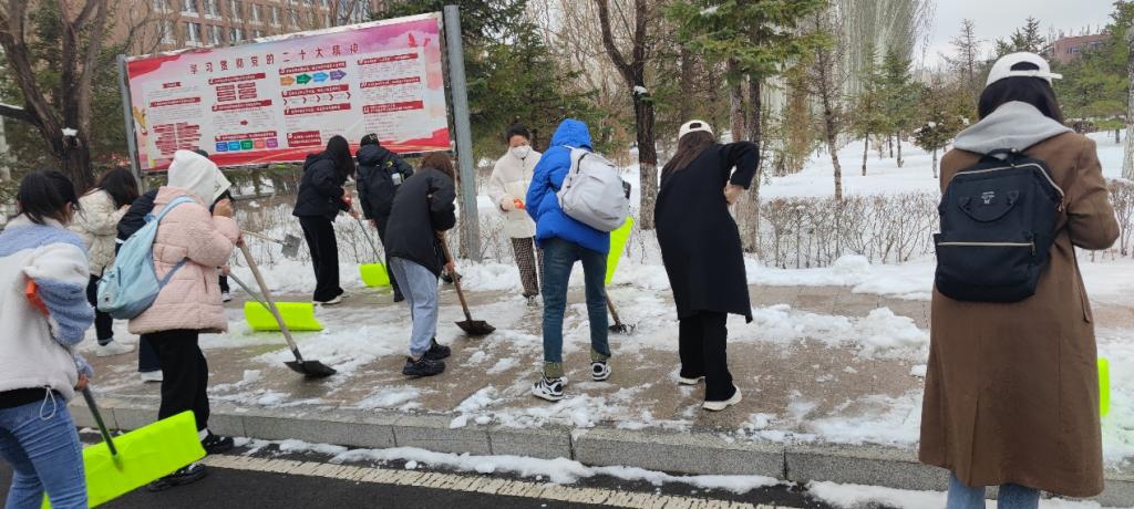 近段时间连续多天的雨雪天气导致道路积雪冰冻严重,为了给师生创建安全、舒适的出行环境,4月5日,文学与新闻传播学院开展“砥砺奋进守初心,青春献礼二十大”主题党日活动。我院全体学生党员及入党积极分子参加了图书馆对面主干道区域的扫雪工作。