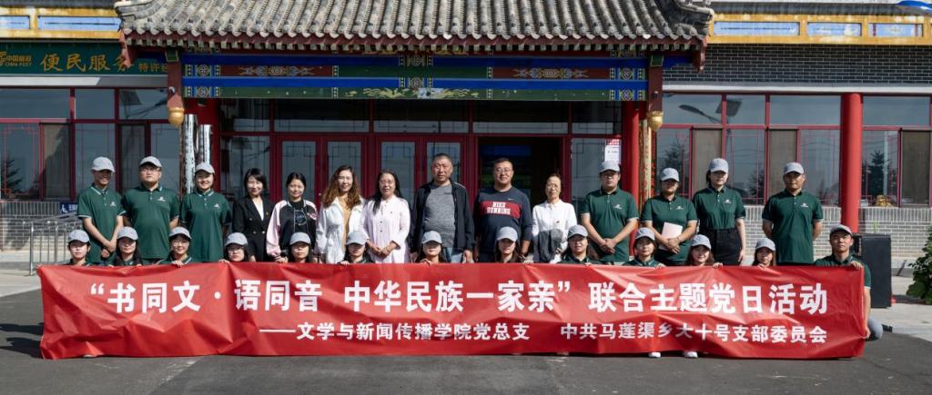 9月是全区民族团结进步宣传月,为进一步铸牢中华民族共同体意识,深化民族团结进步教育,9月13日上午,国家语言文字推广基地(beat365正版唯一官方网站)、文学与新闻传播学院党总支走进马莲渠乡大十号村,联合中共马莲渠乡大十号支部委员会举行了“书同文·语同音 中华民族一家亲”联合主题党日活动,文学与新闻传播学院党总支副书记王维新带队,文学与新闻传播学院师生党员、国家语言文字推广基地国家级、自治区级普通话水平测试员、推普助力乡村振兴志愿者参加活动。