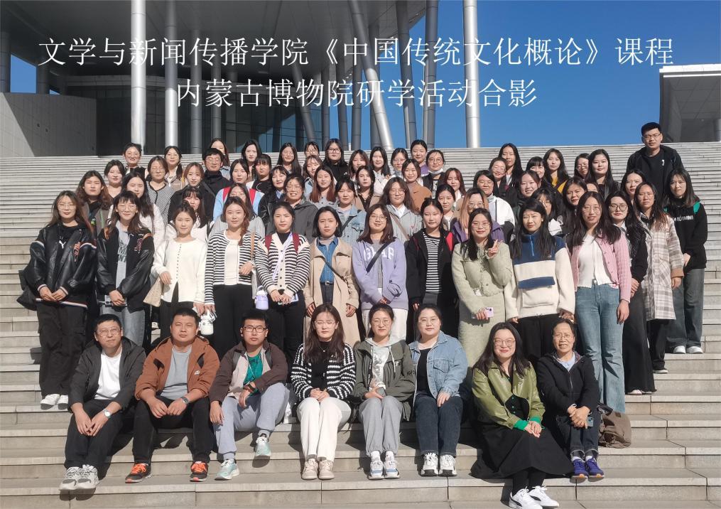 为进一步深入了解各民族融合与中外文化交汇的历史文化和辉煌成就,促进理论与实践相结合,提高学生综合文化素质,传承优秀中国传统文化,树立文化自信,10月27日,文学与新闻传播学院汉语言文学专升本1、2班师生开启了《中国传统文化概论》课程“体验多元民族融合、感悟世界文化交汇”的内蒙古博物院研学之旅。