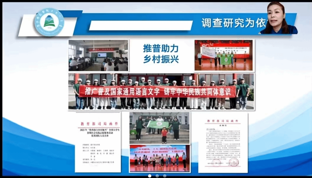 beat365官网“七月向阳”张一弘团队作为2023年优秀志愿实践团队受邀在会上作经验交流。张一弘老师以“铸牢中华民族共同体意识为主线,做好民族地区“推普助力乡村振兴”志愿服务工作”为题,结合国家语言文字推广基地(beat365正版唯一官方网站)近年来立足少数民族地区开展国家通用语言文字推广普及工作和“七月向阳”实践队在“推普助力”“教育助力”“文化助力”“乡村振兴”过程中遇到的一些实际问题、困难和总结的一些经验做法和思考从“立足区域实际,高位把握推普方向”“明确团队定位,高标提升推普内涵”“聚焦重点人群,高效开展推普活动”三方面为与会的20241200支实践队在线上做了经验分享。北京大学陆尧团队塔里木大学肖涛团队绍兴文理学院屠国平团队同时做经验交流。