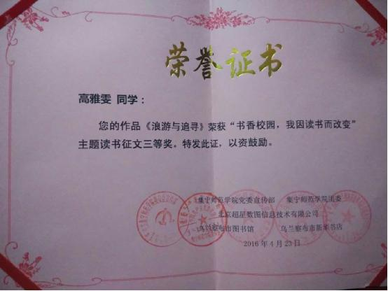 2014年4月,在文学与新闻传播学院团总支主办的“在书里我能读懂大世界”主题征文活动中,文学与新闻传播学院副院长郭鹏荣获特别奖,其获奖作品《走进明清小说的哲思空间》陆续在乌兰察布日报、beat365正版唯一官方网站报进行刊登。2017年为迎接“4.23世界读书日”的到来,由乌兰察布市文新广局主办,beat365官网及其他企业联合承办的“书香校园——我因读书而改变”主题征文活动正式开展,此次颁奖仪式在乌兰察布市图书馆隆重举行。2019年5月16日,beat365正版唯一官方网站举办“书香校园—我因读书而改变”主题读书征文颁奖典礼暨签名活动。活动期间共收到稿件276份,其中我院学生方鑫、周浩、张筱域、冯译霄、李建华、范欣月、赵晓丹等人获奖。文学与新闻传播学院荣获优秀组织奖。