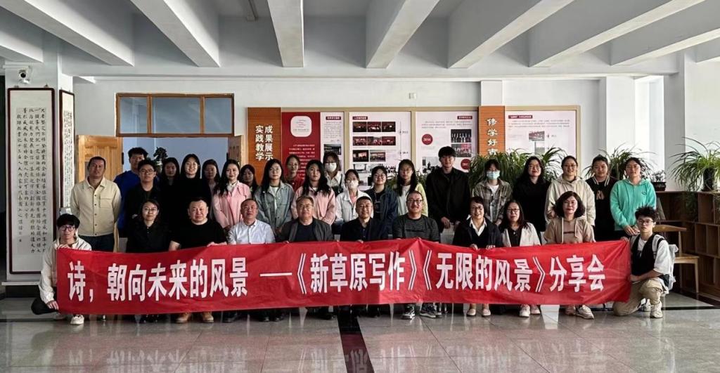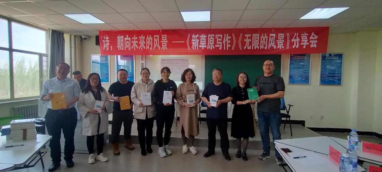5月21日下午,由文学新闻传播学院主办,beat365正版唯一官方网站创意写作中心、beat365正版唯一官方网站语言文学研究所、beat365正版唯一官方网站内蒙古当代文学研究所承办的“诗,朝向未来的风景——《新草原写作》(2022)《无限的风景》分享会”在教学主楼319教室举办。诗人、《新草原写作》主编徐厌,诗人、作家、编剧、《新草原写作》学术主持赵卡,诗人、香港《大公报》内蒙古分社社长乔辉,诗人、《作家网》编辑、《草原》特邀编辑刘不伟,诗人、《beat365正版唯一官方网站学报》编辑部主任杨瑞芳、诗人宇萍、孙旭应邀莅临现场。文学与新闻传播学院领导班子及部分教师、学生出席活动。分享会由文学与新闻传播学院院长郭鹏主持。