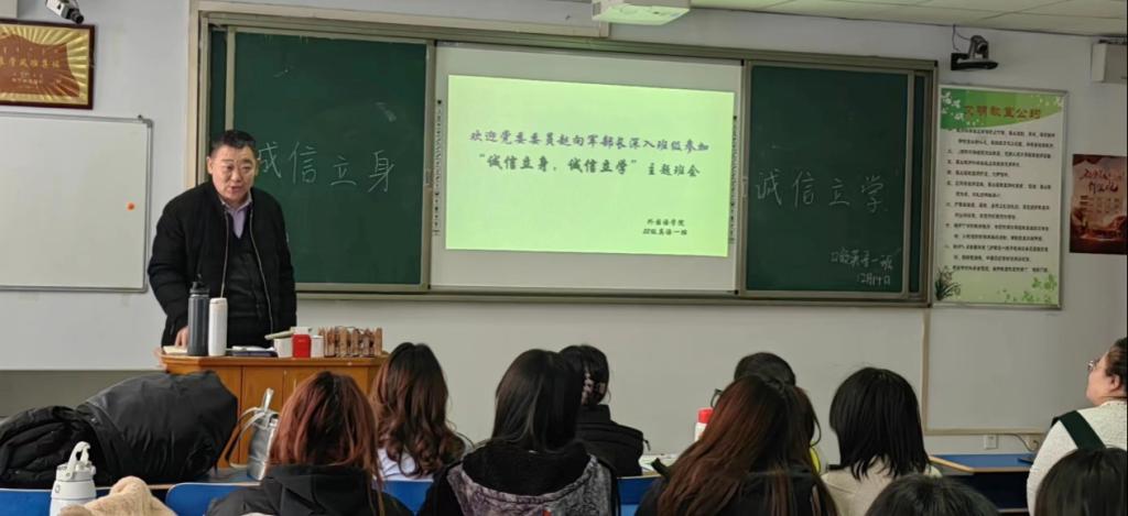 12月14日,beat365官网党委委员、统战部部长赵向军深入外国语学院联系班级22级英语一班参加“诚信立身,诚信立学”主题班会。外国语学院党总支副书记平博杰陪同参加。