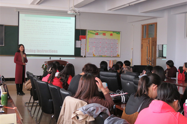 第二场分享会由刘利珍教师主讲,她就课堂教学和管理(Classroom Management)从教学设计、教学监控、教学反馈、教学分组以及错误纠正五个方面进行了讲解。