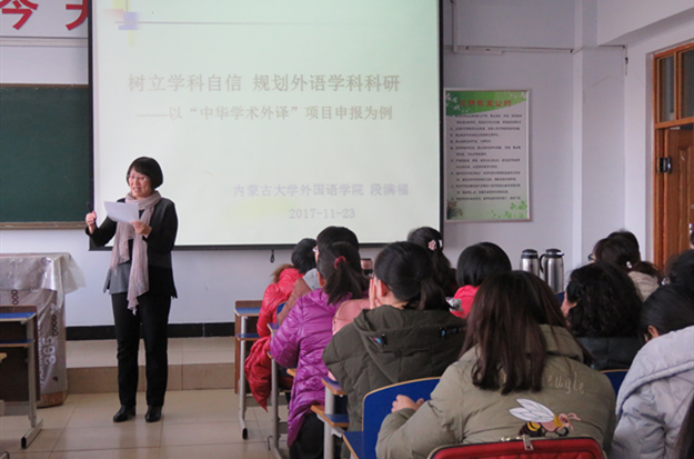 段满福作题为“树立学科自信,规划外语学科科研——以中华学术外译项目申报为例”的报告。段满福在报告中讲述了如何从习总书记系列讲话看外语科研的增长点、外语学科的科研困境以及如何规划外语学科的科研等,并结合自身的课题申报实践经验和研究成果,进一步阐述了外语学科的科研前景以及申报国家级课题和自治区级课题的对策。报告信息量大,例证详实,对外语学科科研具有切实的指导意义。