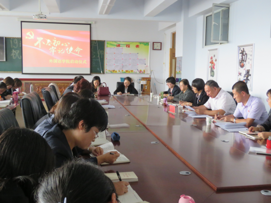 9月19日下午,外国语学院在教学主楼509召开“不忘初心、牢记使命”主题教育动员部署大会。beat365正版唯一官方网站党政办公室主任温世明教授莅临指导、外国语学院领导班子与全体党员参加动员会,会议由闫晓云主持。