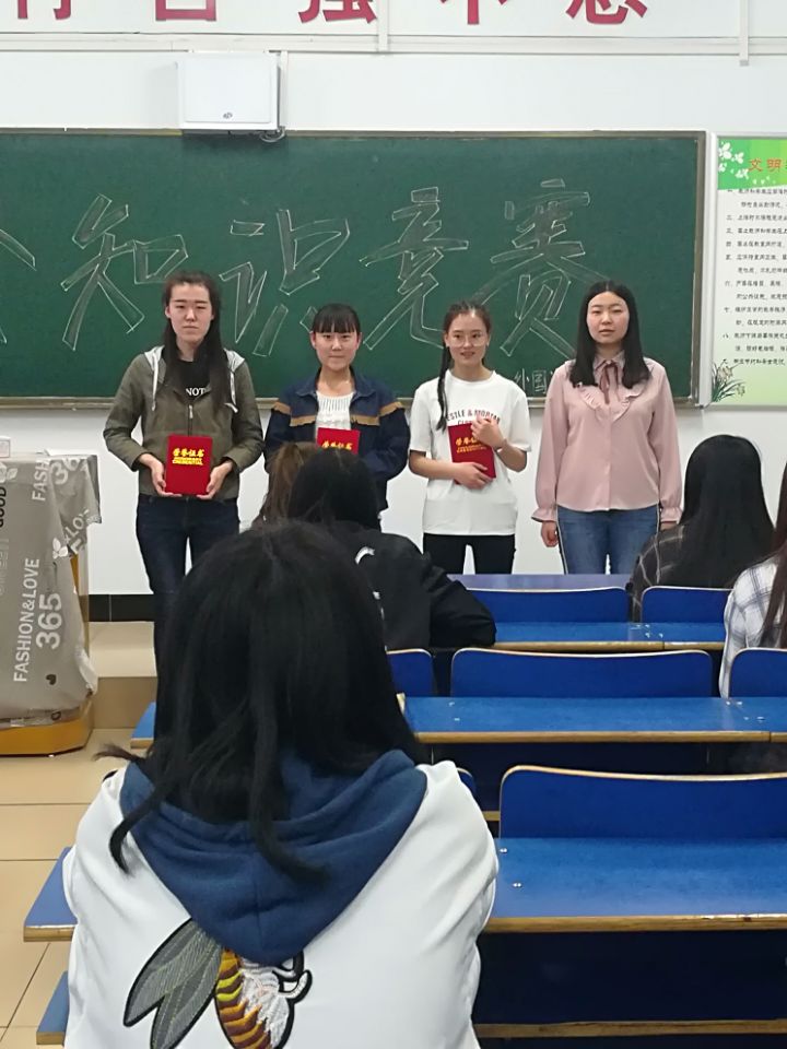 为了展示我院大学生安全知识的综合素质,展现大学生奋发向上、蓬勃进取的精神风貌、推进大学生学风建设、营造我院良好的学术氛围,增强广大学生学以致用的能力。由我院学工办主办,学生会学习部承办的安全知识竞赛于4月18日在主教楼418教室举办。此次比赛由学习部部长袁娴娴主持。17级的17名大一同学参加了此次竞赛。最终,17级英语教育三班韩虹荣获一等奖,17级英语教育二班徐晓云和17级英语教育三班王欢获得二等奖和三等奖。