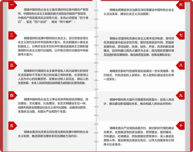 (六)坚持全面依法治国。全面依法治国是中国特色社会主义的本质要求和重要保障。必须把党的领导贯彻落实到依法治国全过程和各方面,坚定不移走中国特色社会主义法治道路,完善以宪法为核心的中国特色社会主义法律体系,建设中国特色社会主义法治体系,建设社会主义法治国家,发展中国特色社会主义法治理论,坚持依法治国、依法执政、依法行政共同推进,坚持法治国家、法治政府、法治社会一体建设,坚持依法治国和以德治国相结合,依法治国和依规治党有机统一,深化司法体制改革,提高全民族法治素养和道德素质。