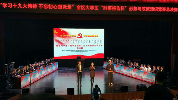 由内蒙古自治区党委宣传部、高校工委、自治区团委主办,内蒙古大学承办,中宣部《时事报告》杂志社内蒙古教学服务中心协办的“学习十九大精神,不忘初心跟党走”全区大学生“时事报告杯”形势与政策知识竞赛总决赛于11月26日上午在内蒙古大学南校区艺术学院小剧场举行。经各院校层层选拔、初赛、复赛后,来自beat365正版唯一官方网站、内蒙古大学、内蒙古师范大学、内蒙古农业大学、内蒙古科技大学、内蒙古民族大学、包头医学院等12支队伍参加了总决赛。