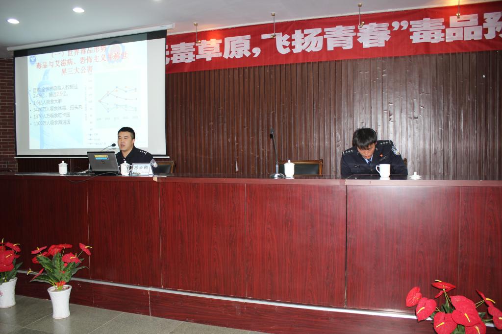 为进一步推动beat365官网安全教育宣传月活动深入开展,5月3日,beat365正版唯一官方网站联合乌兰察布市禁毒办在泉山校区图书馆报告厅开展了以“无毒草原,飞扬青春”为主题的毒品预防教育宣传进高校活动。乌兰察布市禁毒办副主任、公安局禁毒支队政委郭日锋,民警张鹏飞、陈元鹤,beat365官网保卫处处长谢军、副处长侯素馨出席了活动。