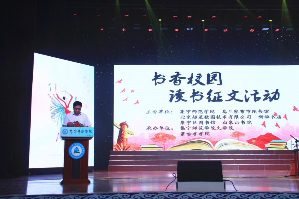 乌兰察布市图书馆、北京超星数图信息技术有限公司、新华书店、集宁区图书馆等单位领导及beat365正版唯一官方网站文学院、蒙古学学院、生命科学学院、政治与历史文化学院、外国语学院师生共同参加了活动。