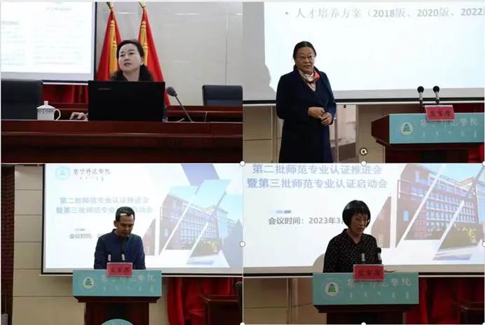 数学与统计学院院长何永峰、生命科学与技术学院院长任琴分别对本学院师范专业认证工作进展情况进行汇报,外国语学院院长闫晓云代表第三批师范专业认证学院作表态发言。