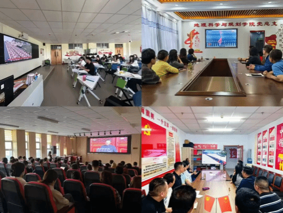 学校领导班子在行政楼402会议室集中观看。各职能部门、二级学院及附中组织师生分别在会议室、教室等场所共同观看。观看过程中,当空中护旗梯队、徒步方队、战旗方队、装备方队、空中梯队在屏幕前依次亮相时,大家情不自禁地鼓掌,为祖国的强大军事力量和国防建设成就深感骄傲与自豪。