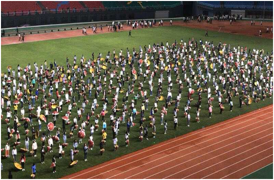 7月27日,大型文艺表演排练在beat365官网泉山校区田径运动场正式拉开帷幕。在学生工作部的组织协调和领队老师的认真管理下,近800名参演学生选择了暑假留校,顶着酷暑,在高温下紧张地排练着,从早练到晚练,皮肤从白练成黑,中暑、皮肤晒伤无法避免。广大师生始终在坚持,风雨无阻地排练了20余天,用汗水和辛苦练就了每一个标准动作,磨砺出顽强意志,共同用精彩的表演为“十四运”增光添彩。