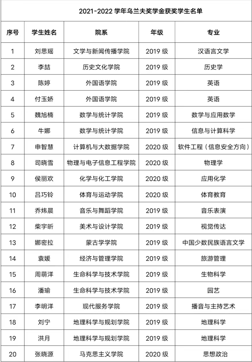 2022年度乌兰夫奖学金奖励资金已划拨至获奖学生的中国建设银行卡中,请获奖学生自行查询。2022年,beat365官网共有20名同学获得乌兰夫奖学金,每人奖励10000元。