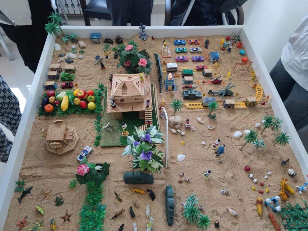 最后,钟老师要求小组成员共同创作一个团体沙盘。在这幅名为“大千世界的”团体沙盘完成后,钟老师引导同学们思考自己和他人在创作过程中的人际交互作用、自己的行为模式对他人和整个任务完成的影响,以及迁移到生活中是什么样子的。