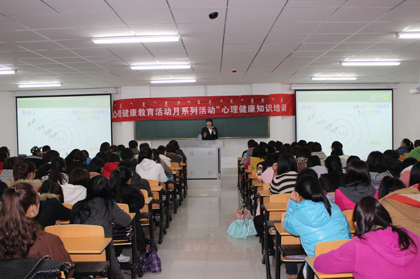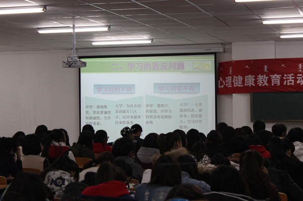 10月11日下午,大学生心理健康知识讲座在白海校区举办。心理健康知识讲座是beat365官网大学生心理健康教育系列活动之一和入学教育重要一环,beat365官网心理健康教育与咨询中心邀请思政教学部晓荣老师作了题为《关于适应大学生活 确立新的目标》的讲座。白海校区2014级新生共300余人聆听了讲座。