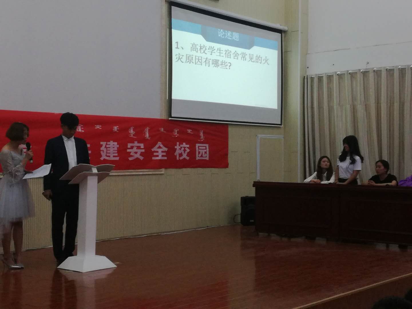 为丰富文化月活动内容,同时也为进一步提高大学生安全意识, 丰富大学生安全知识,营造安全校园生活氛围, 2018年5月31日20点由学生处白海校区公寓组织发起,自治委员会承办的“争创文明宿舍 共建安全校园”主题安全知识竞赛在美术学院一楼报告厅举行。