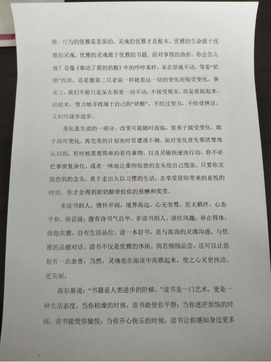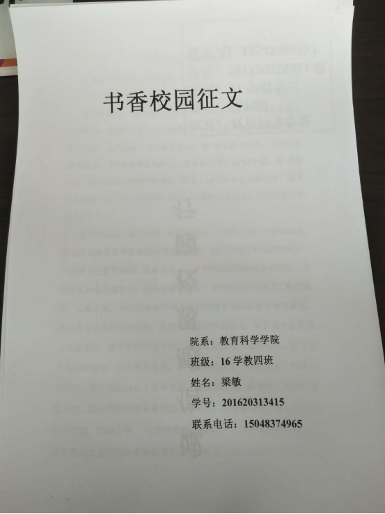 此次“书香校园·我因读书而改变”征文大赛为广大热爱读书的学生提供了一个展现自己的舞台,日后,教育科学学院也会多多举办此类活动,本次征文大赛系级比赛圆满结束。