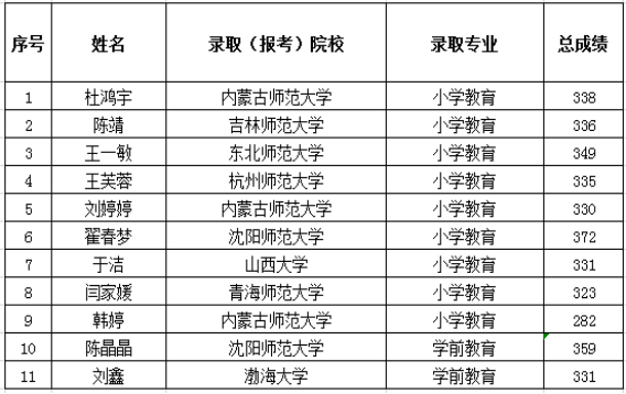 热烈祝贺我院学生在2019年硕士研究生考试中上线16人。其中,2015级小学教育本科班杜鸿宇、陈靖、王一敏、王芙蓉、刘婷婷、翟春梦、于洁、闫家媛、韩婷;2015级学前教育本科班陈晶晶、刘鑫共11位同学被录取,考研成绩喜人。