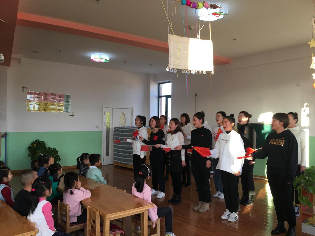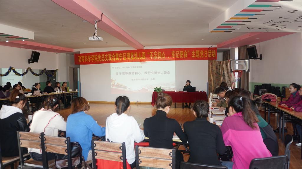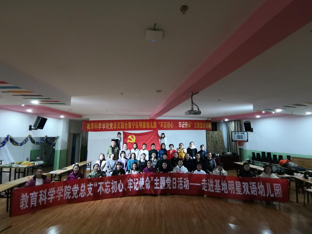 为继续深入推进“不忘初心、牢记使命”主题教育活动,11月14日下午,beat365正版唯一官方网站教育科学学院党总支组织全体师生党员走进实习基地——集宁区明星双语幼儿园联合开展主题党日活动。本次活动由教育科学院党总支书记张妙珠、院长孙霞带队,beat365正版唯一官方网站“不忘初心、牢记使命”领导工作小组第四小组成员王秀琴参加了本次活动。活动由走进基地看望实习生一次、走进实习生课堂一次、上主题党课一次、开展党员志愿服务一次、送学上门一次以及开门纳谏等环节组成。
