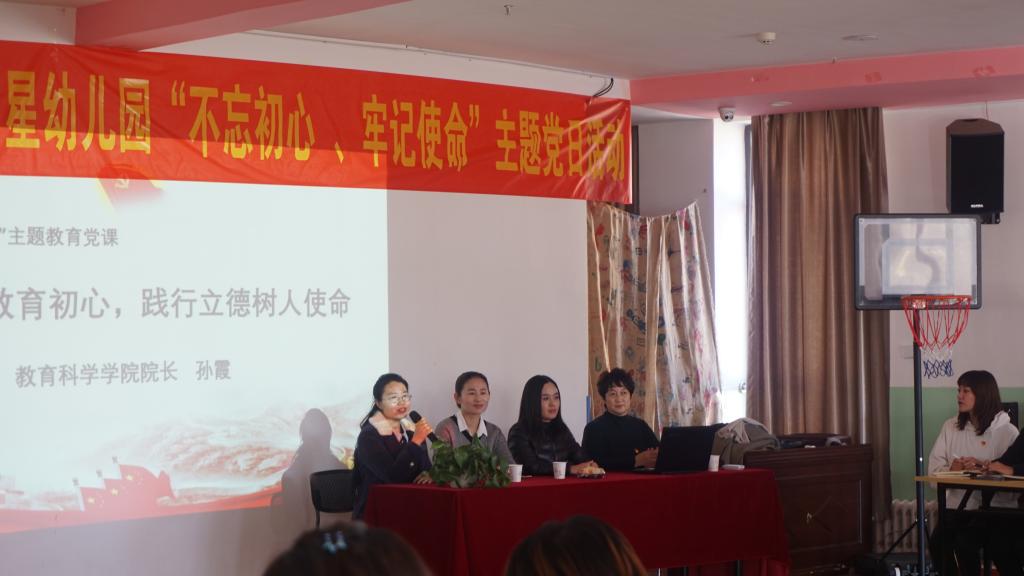 参观结束,教育科学学院院长孙霞为全体师生党员和在此实习的流动党员以及该幼儿园的老师们讲了一堂“坚守高等教育初心,践行立德树人使命”的主题教育党课。党课围绕“学习习近平关于立德树人的重要论述、准确把握立德树人的时代内涵、坚守高等教育初心,着力培养社会主义建设者和接班人”三个方面展开。孙院长引经据典、由浅入深着重阐释了教师职业道德的本质和以身立教的内涵,既有理论高度又有实践温度。同时,党总支书记张妙珠和院长孙霞代表教育科学学院党总支为在此实习的两名党员再次送上了相关的学习资料,叮嘱她们一定要认真学习,以党员的标准严格要求自己,完成好实习的相关任务,在实习基地发挥好党员的模范带头作用。