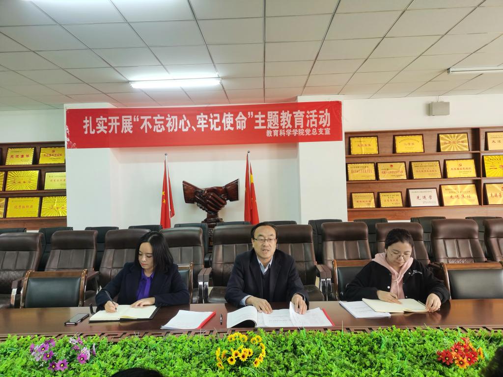 教育科学学院党总支书记张妙珠对学院党史学习教育作了阶段性汇报,她指出,自党中央召开党史学习教育动员大会以来,教育科学学院党总支高度重视党史学习教育工作,及时组织开展了“忆党史唱红歌”的主题党日活动,重温入党誓词,拉开了我院党史学习教育的序幕。自学校召开党史学习教育动员会之后,我院严格按照学校党委的相关工作要求,成立教育科学学院党史学习教育领导工作组,扎实有效推进党史学习教育工作。具体表现在以下三个方面:一是紧紧围绕学校党委决策部署,认真贯彻学校工作要求,对接落实学校巡回指导组工作安排;二是紧紧结合学院实际,成立党史学习教育领导工作组,修改制定党史学习教育实施方案,召开动员部署大会;三是紧紧贴近主题主线,全面开展学习,围绕“我为师生办实事”在我院全体师生中征集意见,把党史学习教育进一步落到实处。