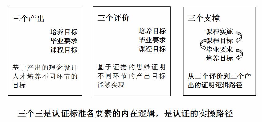 本次师范类专业认证,OBE是专业人才培养体系设定的原则性理念,即“产出导向的人才培养体系”,认证关注点可以概括为“三个三”。