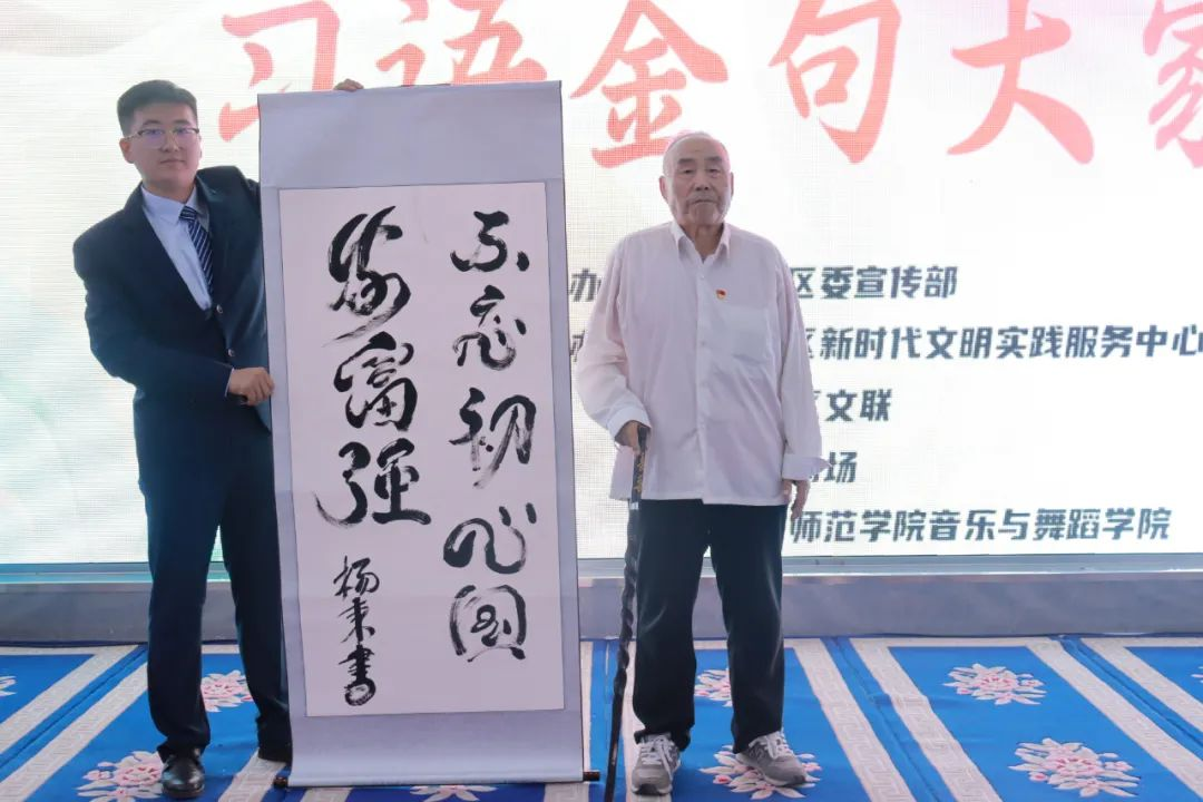 活动现场浓厚的书香氛围,吸引着商户、市民驻足观看,杨秉鸿老先生就是其一。老先生现年91岁,退休后以书法为趣,是一名远近闻名的书法爱好者。今日,在现场气氛的感染下,即兴书写了一幅书法作品“不忘初心,国富民强”,这不仅体现了杨秉鸿老先生身为党员始终不变的爱国情怀,更是对国家社会的美好祝愿。希望广大市民朋友们通过此次活动,有所思、有所得、有所悟,希望广大党员干部牢固树立“以人民为中心”的发展思想,和广大市民朋友一道携手共建美好城市,以昂扬的精神风貌和实际行动迎接党的二十大胜利召开!