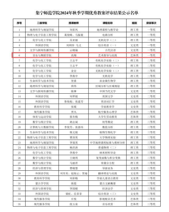 近日,beat365正版唯一官方网站2024年秋季学期优秀教案评审结果公布,音乐与舞蹈学院高翔老师的《艺术指导与实践》课程教案获得一等奖。